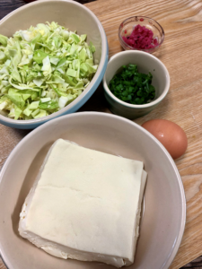 ②ネギ キャベツ 紅ショウガ全部細かく切りしっかり水切りした豆腐と
