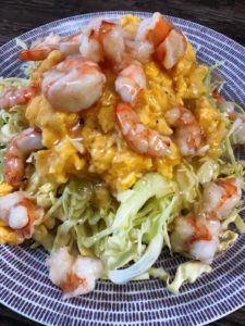 4.千切りにしたキャベツをお皿に盛り付けその上に卵をのせエビの餡をかけて出来上がり。