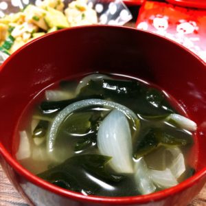 わかめと玉ねぎのスープ。中華スープベースです。