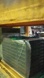 柿が収穫から、倉庫に帰ってくる“室”と言う名前のビニールの部屋に入れます。下の写真のようにきれいに積み上げていきます。