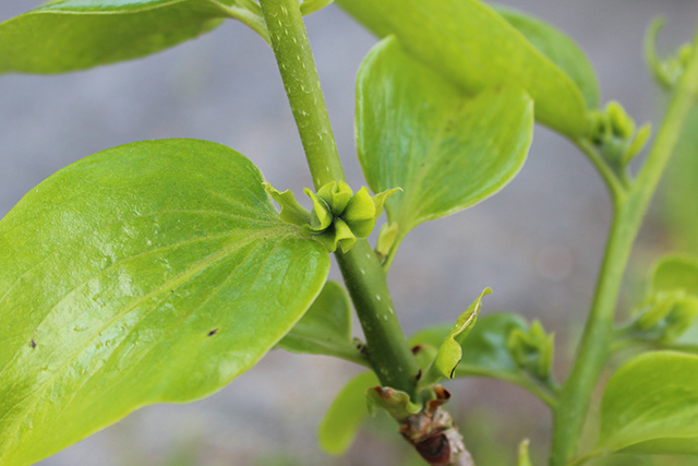 4月下旬、発芽した柿のつぼみが膨らんでゆきます。この可愛いつぼみが、のちの摘蕾作業で小憎たらしく見える事もあります(笑)