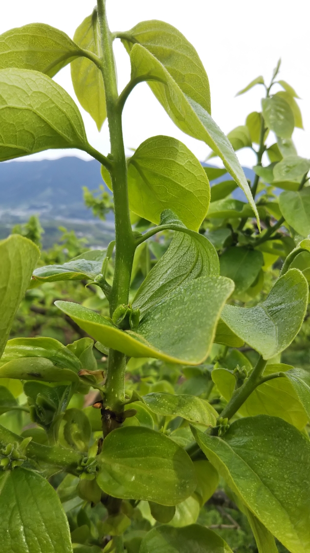 一つの枝にたくさんのつぼみが出来ます。これを放っておくと、果実同士で栄養の奪い合いになるので、バランスを見ながら余分なつぼみを手で摘んでゆきます。柿の木1本でも膨大な量のつぼみ、柿山を見渡すとクラっとします^^;