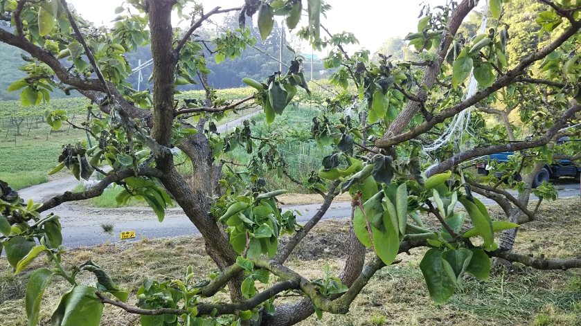 柿畑では、新緑が広がって、天気も良く、仕事日和だと思ってましたが、 一晩で新緑が、茶色に変わってしま