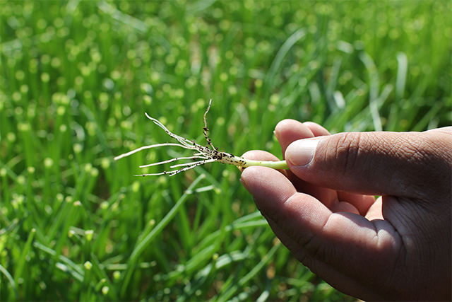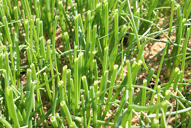 玉ねぎを大きく、上部に育てるために剪葉といって成長途中の苗の上部を切って揃えます。何千本の細い苗を手作業でカットしていく気が遠くなる工程です。